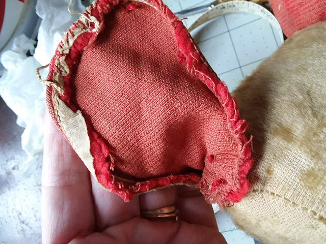 One thing the ladies on The Repair Shop always do is to keep any little damaged parts of the animal, put them into a little cloth pouch, and put them inside the animal before they close him up, so that no part of the animal is lost. Isn't that sweet? So I took Doggy's old eyes and slipped them inside one of his ears under the liner -- just where I used to keep secret notes 50 years ago.